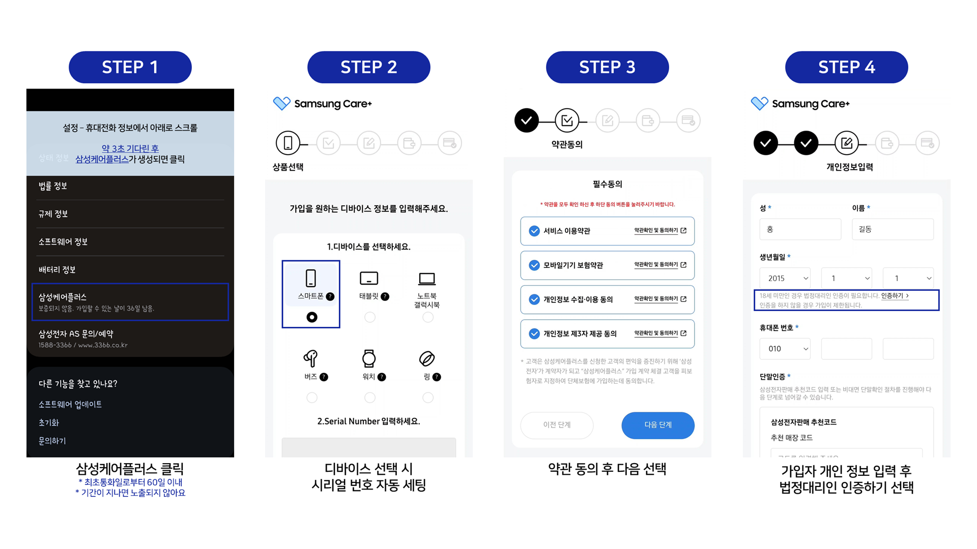 노트북, 태블릿, 버즈, 워치/핏, 링 제품은 구매일 기준 60일 이내에 가입 가능해요. [노트북, 태블릿] - 삼성멤버스 앱 > 혜택 > 삼성케어플러스 상품 가입하기 - 별도의 실물 확인 절차 없이 구매일 기준 60일 이내 기기에서 가입 가능 [버즈, 워치/핏, 링] - 가입페이지 : https://rg2.samsungcareplus.com/kr#/ - 별도의 실물 확인 절차 없이 제품 구입 후 60일 이내 가입 가능 ※ 구매 60일 이내 제품이 가입 기간 경과로 나온다면, 채팅상담 또는 보상센터 1566-4590 으로 문의해 주세요. 채팅상담 바로가기 : https://happytalk.io/l/9Hg0as